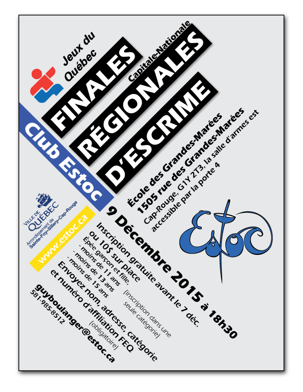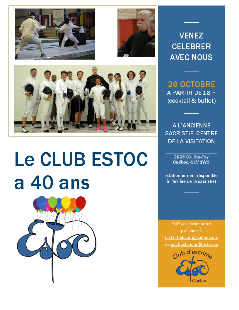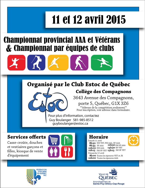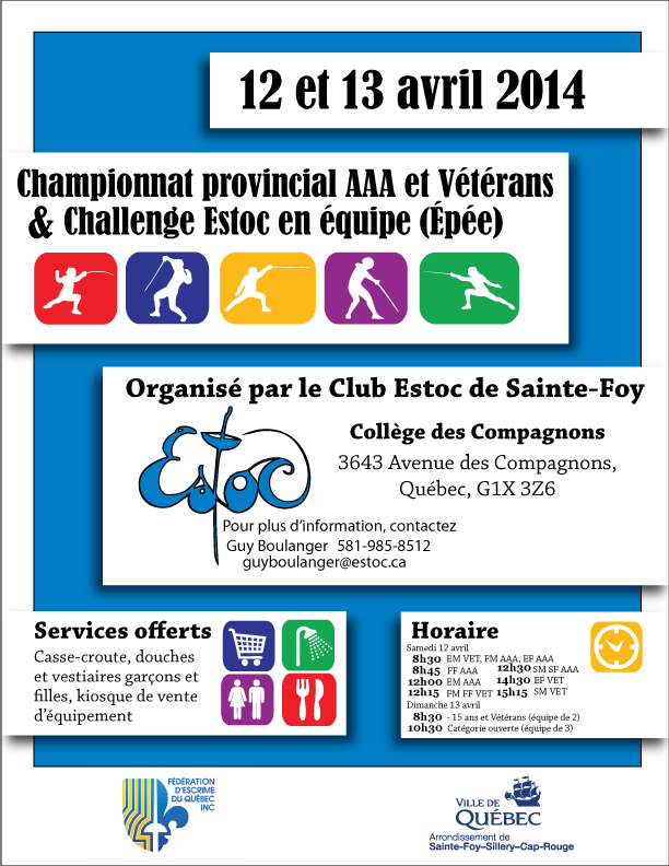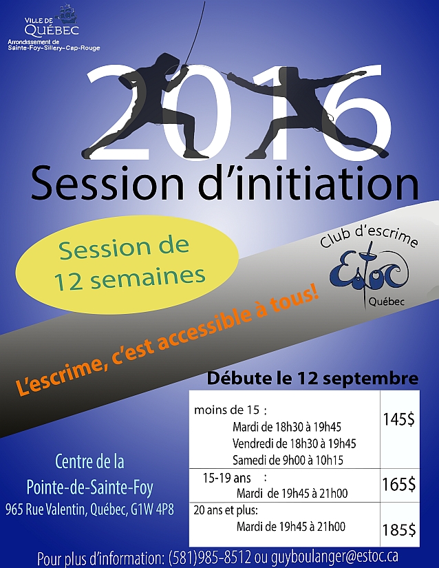 Programmation et tarifs disponibles sur le site Web du Club Estoc (http://www.estoc.ca/tarifs_epee.htm). Pour toute information, veuillez SVP communiquer avec moi (tél: 581-985-8512 / courriel: guyboulanger@estoc.ca).