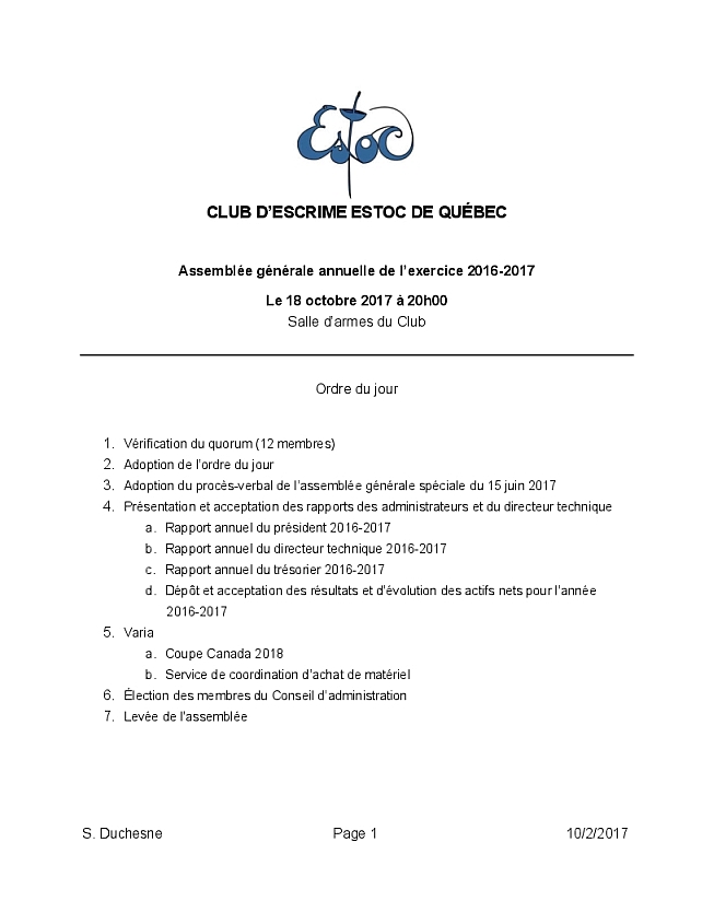 L'Assemblée générale annuelle 2021 du Club d'escrime Estoc de Québec a eu lieu hier soir, le lundi 11 octobre.  17 membres ont assisté à l'AGA virtuelle qui a accepté les rapports présentés et nommé les administrateurs au conseil de direction.  Deux membres ne se sont pas représentés, Simon Duchesne et André Lavergne, que nous remercions pour leur grande contribution au conseil ces dernières années.