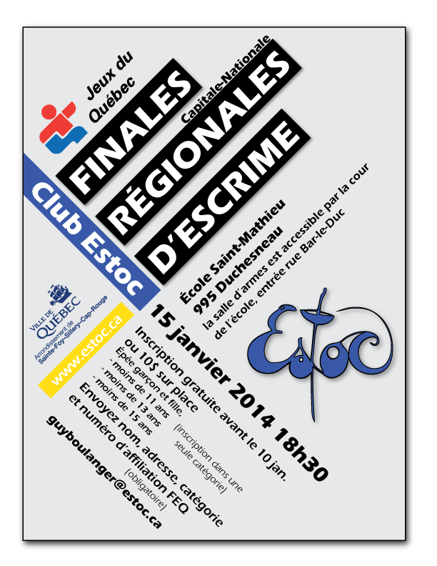 La finale régionale des Jeux du Québec est maintenant chose du passé, et quatre membres du club Estoc ont monopolisé les quatre places disponibles à l'épée.  Ils représenteront donc la région aux finales provinciales de Rimouski, du 7 au 10 mars prochains.  Bravo à :