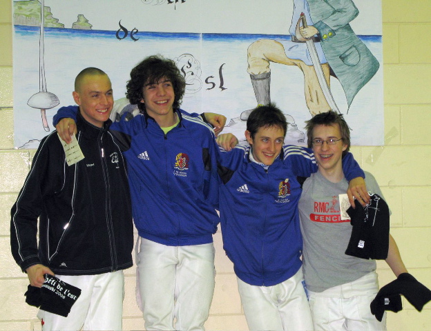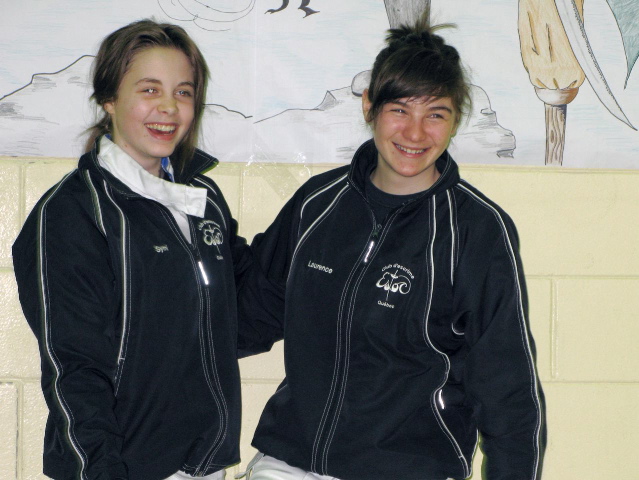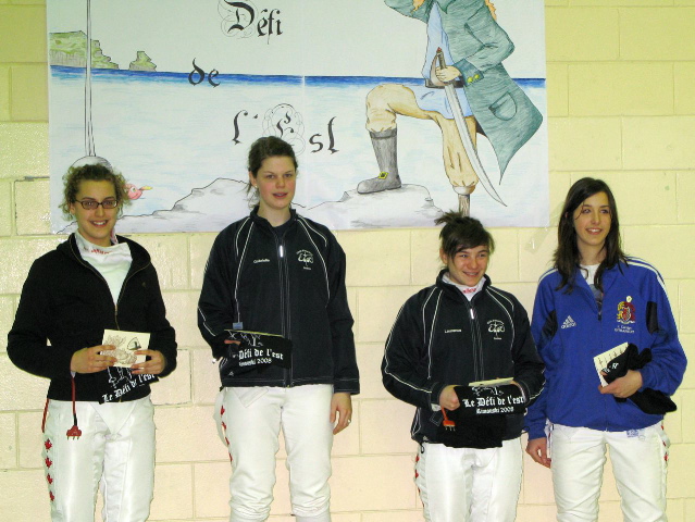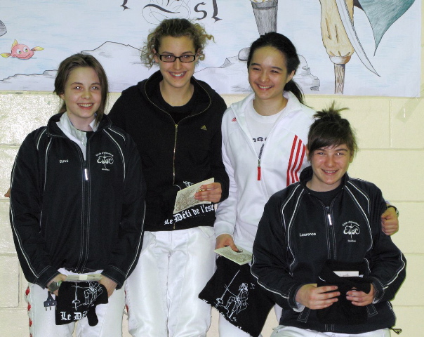 Le podium EF cadette à Rimouski: Symi Caroussos (Estoc, 2e), Andréanne Demers (CRA, 1ère), Louise Fournier (MOU, 3e) et Laurence Beaulieu-Carbonneau (Estoc, 3e) Deux escrimeuses souriantes : Symi Caroussos et Laurence Beaulieu-Carbonneau .