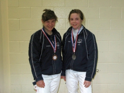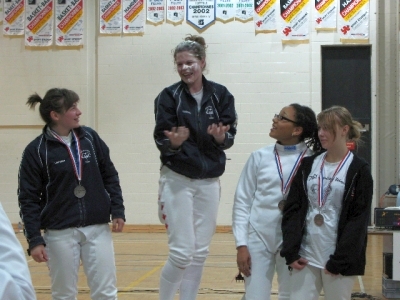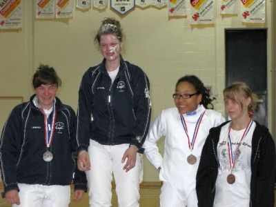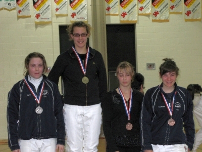 Le podium EF cadette à Granby: Symi Caroussos (Estoc, 2e), Andréanne Demers (CRA, 1ère), Joanna Kolbe (MIS, 3e) et Laurence Beaulieu-Carbonneau (Estoc, 3e) Deux escrimeuses souriantes : Laurence Beaulieu-Carbonneau et Symi Caroussos.
