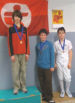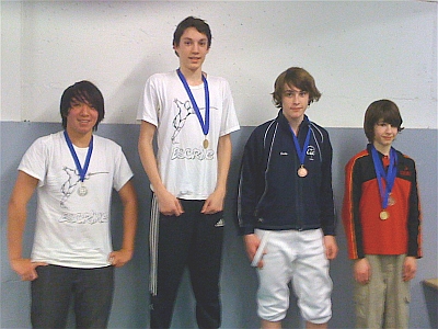 Les jeunes épéistes qui vont représenter la région de Québec à la finale provinciale 2009 : Jules Coupal-Lafleur, Clément Féménias-Métivet, Mathilde Côté et A. A. Le podium masculin -15 ans : Jules Coupal-Lafleur (2e), Clément Féménias-Métivet (1er), Émile Perreault (3e) et Benoît Lachance (3e) Le podium EF -15 ans: A. A. (1ère) et Mathilde Côté (2e) Le podium -13 ans : de gauche à droite, Benoît Lachance (1er), Thomas Couet (3e) et Jean-Sébastien Verret (3e).